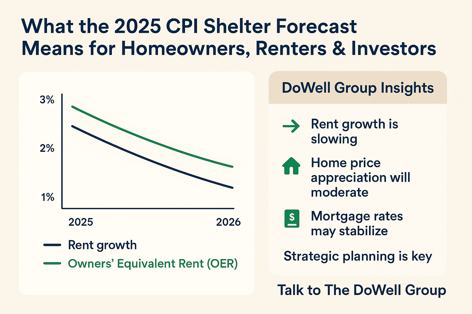 The latest housing inflation forecast from Zillow signals a potential shift in the real estate landscape. Rents and shelter costs are expected to slow significantly through late 2025 and into 2026. For our community at The DoWell Group, this creates new opportunities for homeowners, buyers, renters, and investors.
